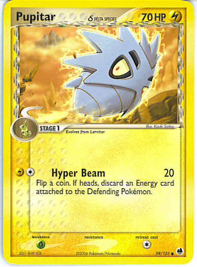 | Type | Lightning | | Pokemon serie | Dragon Frontiers | | Stadie | Stage 1 | | HP | 70 | | Sjældenhed | Common | | Tilbagetrækning | 1 | | Svaghed | W | | Kortnummer | 59 | | Evne | [CL] Hyper Beam (20) Flip a coin. If heads, discard an Energy Card attached to the Defending Pokemon.