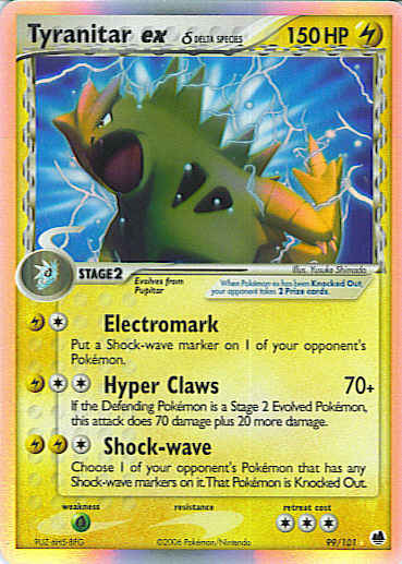 | Type | Lightning | | Pokemon serie | Dragon Frontiers | | Stadie | Stage 2 | | HP | 150 | | Sjældenhed | Ultra-Rare | | Tilbagetrækning | 3 | | Svaghed | G | | Kortnummer | 99 | | Evne | [CL] Electromark - Put a Shock-wave marker on 1 of your opponent's Pokemon. [CCL] Hyper Claws (70+) If the Defending Pokemon is a Stage 2 Evolved Pokemon, this attack does 70 damage plus 20 more damage. [CLL] Shock-wave - Choose 1 of your opponent's Pokemon that has any Shock-wave markers on it. That Pokemon is Knocked Out.
