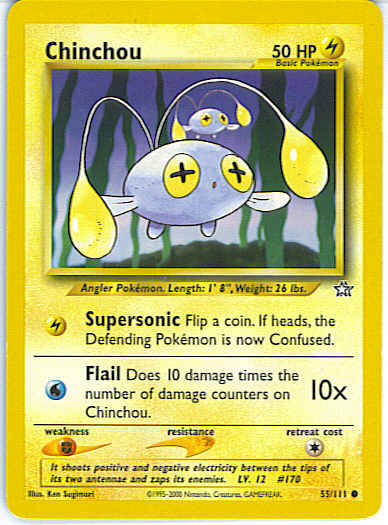 | Type | Lightning | | Pokemon serie | Neo Genesis | | Stadie | Basic | | HP | 50 | | Sjældenhed | Common | | Tilbagetrækning | 1 | | Svaghed | F | | Kortnummer | 55 | | Evne |