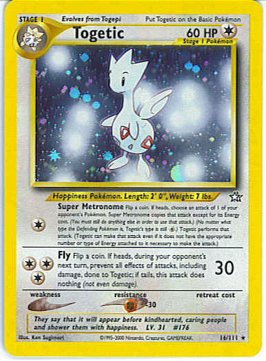 [C] Super Metronome - Flip a coin. If heads, choose an attack of 1 of your opponent's Pokemon. Super Metronome copies that attack except for its Energy cost. (You must still do anything else in order to use that attack.) (No matter what type the Defending Pokemon is, Togetic's type is still Colorless.) Togetic performs that attack. (Togetic can make that attack even if it does not have the appropriate number or type of Energy attached to it necessary to make the attack.)