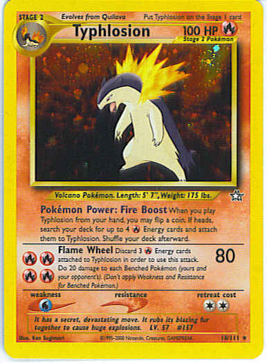 | Type | Fire | | Pokemon serie | Neo Genesis | | Stadie | Stage 2 | | HP | 100 | | Sjældenhed | Rare | | Tilbagetrækning | 2 | | Svaghed | W | | Kortnummer | 18 | | Evne |