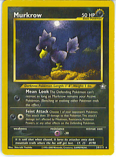 | Type | Darkness | | Pokemon serie | Neo Genesis | | Stadie | Basic | | HP | 50 | | Sjældenhed | Rare | | Modstand | P | | Kortnummer | 24 | | Evne |