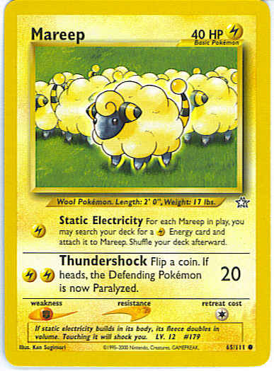 | Type | Lightning | | Pokemon serie | Neo Genesis | | Stadie | Basic | | HP | 40 | | Sjældenhed | Common | | Tilbagetrækning | 1 | | Svaghed | F | | Kortnummer | 65 | | Evne |