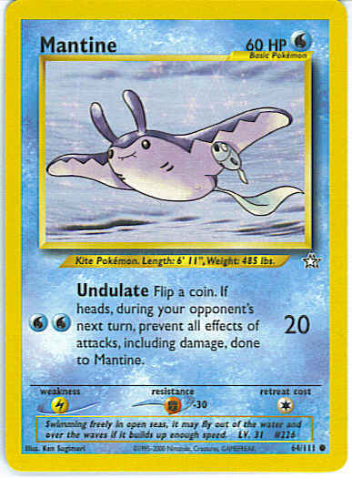 | Type | Water | | Pokemon serie | Neo Genesis | | Stadie | Basic | | HP | 60 | | Sjældenhed | Common | | Tilbagetrækning | 1 | | Modstand | F | | Svaghed | L | | Kortnummer | 64 | | Evne |