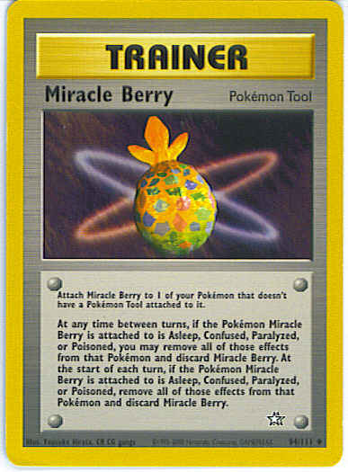 Attach Miracle Berry to 1 of your Pokemon that doesn't have a Pokemon Tool attached to it. At any time between turns, if the Pokemon Miracle Berry is attached to is Asleep, Confused, Paralyzed, or Poisoned, you may remove all of those effects from that Pokemon and discard Miracle Berry. At the start of each turn, if the Pokemon Miracle Berry is attached to is Asleep, Confused, Paralyzed, or Poisoned, remove all of those effects from that Pokemon and discard Miracle Berry.