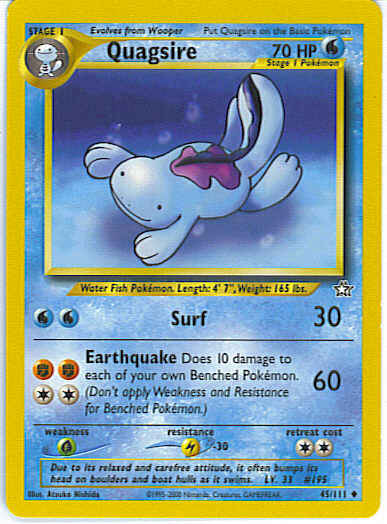 | Type | Water | | Pokemon serie | Neo Genesis | | Stadie | Stage 1 | | HP | 70 | | Sjældenhed | Uncommon | | Tilbagetrækning | 2 | | Modstand | L | | Svaghed | G | | Kortnummer | 45 | | Evne |