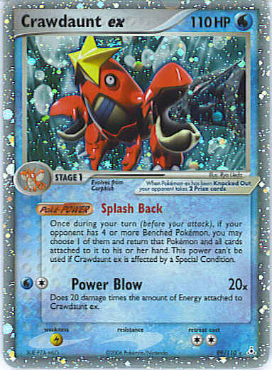 | Type | Water | | Pokemon serie | Holon Phantoms | | Stadie | Stage 1 | | HP | 110 | | Sjældenhed | Ultra-Rare | | Tilbagetrækning | 2 | | Svaghed | L | | Kortnummer | 99 | | Evne | [CW] Power Blow (20x) Does 20 damage times the amount of Energy attached to Crawdaunt ex. [CCCP] Psyburn (70) | | Evne2 | [CW] Power Blow (20x) Does 20 damage times the amount of Energy attached to Crawdaunt ex. [CCCP] Psyburn (70) | | Kunstner | Mitsuhiro Arita |