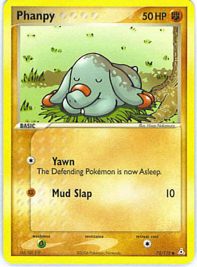 | Type | Fighting | | Pokemon serie | Holon Phantoms | | Stadie | Basic | | HP | 50 | | Sjældenhed | Common | | Tilbagetrækning | 1 | | Svaghed | G | | Kortnummer | 75 | | Evne | [C] Yawn - The Defending Pokemon is now Asleep. [F] Mud Slap (10) | | Evne2 | [C] Yawn - The Defending Pokemon is now Asleep. [F] Mud Slap (10) | | Kunstner | Yuka Morii |