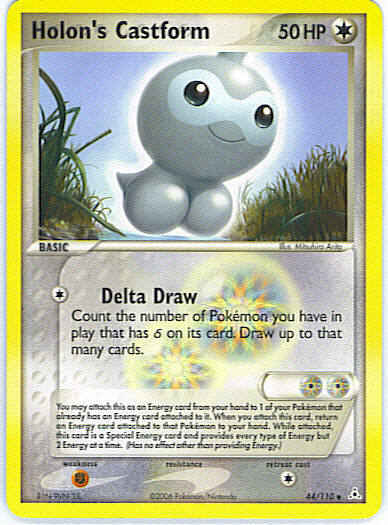 | Type | Colorless | | Pokemon serie | Holon Phantoms | | Stadie | Basic | | HP | 50 | | Sjældenhed | Uncommon | | Tilbagetrækning | 1 | | Svaghed | F | | Kortnummer | 44 | | Evne | [C] Delta Draw - Count the number of Pokemon you have in play that has Delta Species on its card. Draw up to that many cards. You may attach this as an Energy card from your hand to 1 of your Pokemon that already has an Energy card attached to it. When you attach this card, return an Energy card attached to that Pokemon to your hand. While attached, this card is a Special Energy | | Evne2 | [C] Delta Draw - Count the number of Pokemon you have in play that has Delta Species on its card. Draw up to that many cards. You may attach this as an Energy card from your hand to 1 of your Pokemon that already has an Energy card attached to it. When you attach this card, return an Energy card attached to that Pokemon to your hand. While attached, this card is a Special Energy | | Kunstner | Yukiko Baba |