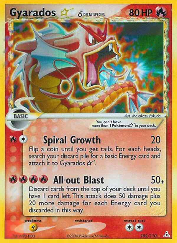[CR] Spiral Growth (20) Flip a coin until you get tails. For each heads, search your discard pile for a basic Energy card and attach it to Gyarados *.