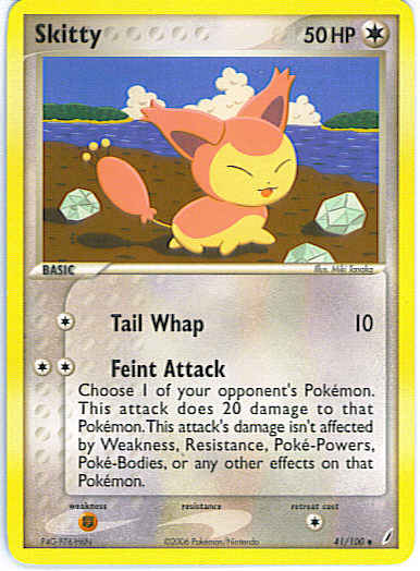 | Type | Colorless | | Pokemon serie | Crystal Guardians | | Stadie | Stage 1 | | HP | 50 | | Sjældenhed | Uncommon | | Tilbagetrækning | 1 | | Svaghed | F | | Kortnummer | 41 | | Evne | [C] Tail Whap (10) [CC] Feint Attack - Choose 1 of your opponent's Pokemon. This attack does 20 damage to that Pokemon. This attack's damage isn't affected by Weakness, Resistance, Poke-Powers, Poke-Bodies, or any other effects on that Pokemon. | | Evne2 | [C] Tail Whap (10) [CC] Feint Attack - Choose 1 of your opponent's Pokemon. This attack does 20 damage to that Pokemon. This attack's damage isn't affected by Weakness, Resistance, Poke-Powers, Poke-Bodies, or any other effects on that Pokemon. | | Kunstner | Miki Tanaka |