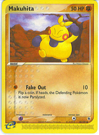 | Type | Fighting | | Pokemon serie | Ruby Sapphire | | Stadie | Basic | | HP | 50 | | Sjældenhed | Common | | Tilbagetrækning | 1 | | Svaghed | P | | Kortnummer | 58 | | Evne | [F] Fake Out (10) Flip a coin. If heads, the Defending Pokemon is now Paralyzed.