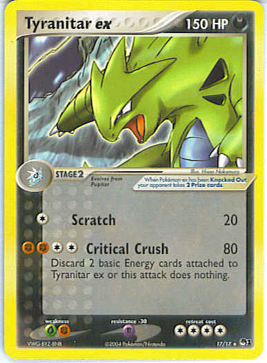 | Type | Darkness | | Pokemon serie | OP Series 1 | | Stadie | Stage 2 | | HP | 150 | | Sjældenhed | Ultra-Rare | | Tilbagetrækning | 4 | | Modstand | P | | Svaghed | GR | | Kortnummer | 17 | | Evne | [C] Scratch (20) [CCFF] Critical Crush (80) Discard 2 basic Energy cards attached to Tyranitar ex or this attack does nothing.
