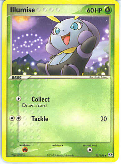 | Type | Grass | | Pokemon serie | Emerald | | Stadie | Basic | | HP | 60 | | Sjældenhed | Uncommon | | Tilbagetrækning | 1 | | Svaghed | R | | Kortnummer | 32 | | Evne | [C] Collect - Draw a card. [CC] Tackle (20) | | Evne2 | [C] Collect - Draw a card. [CC] Tackle (20) | | Kunstner | Kouki Saitou |