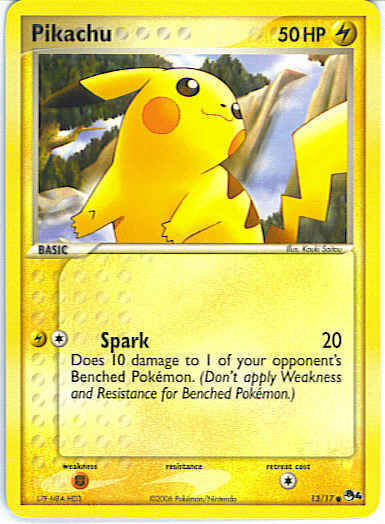 | Type | Lightning | | Pokemon serie | OP Series 4 | | Stadie | Basic | | HP | 50 | | Sjældenhed | Common | | Tilbagetrækning | 1 | | Svaghed | F | | Kortnummer | 13 | | Evne | [CL] Spark (20) Does 10 damage to 1 of your opponent's Benched Pokemon. (Don't apply Weakness and Resistance for Benched Pokemon.)