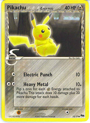 | Type | Metal | | Pokemon serie | OP Series 5 | | Stadie | Basic | | HP | 40 | | Sjældenhed | Common | | Tilbagetrækning | 1 | | Svaghed | F | | Kortnummer | 13 | | Evne | [C] Electric Punch (10) [CC] Heavy Metal (10+) Flip a coin for each M Energy attached to Pikachu. This attack does 10 damage plus 20 more damage for each heads.